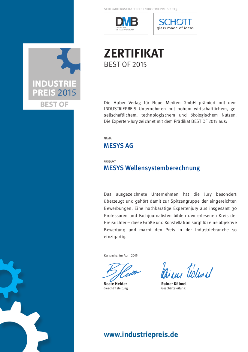Die MESYS Wellensystemberechnung wurde beim Industriepreis des Huber Verlags für neue Medien GmbH mit dem Prädikat BEST OF 2015 ausgezeichnet.